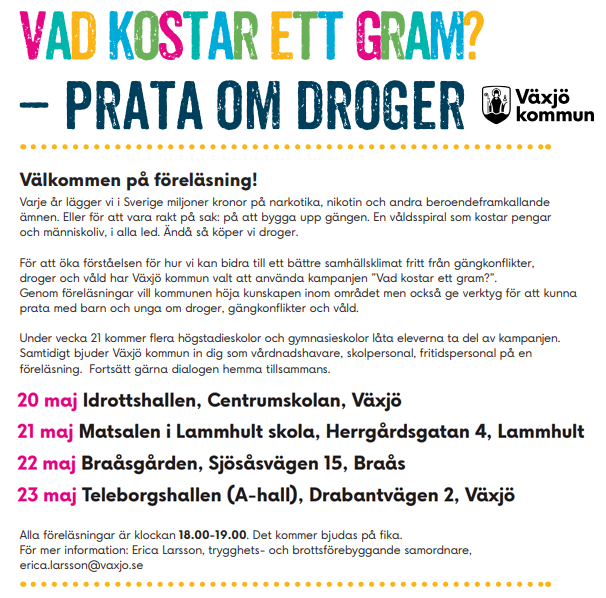 Växjö kommun bjuder in elever och föräldrar till en föreläsning för att prata om droger. Föreläsningen pågår kl. 18-19 på nedan datum och platser:
